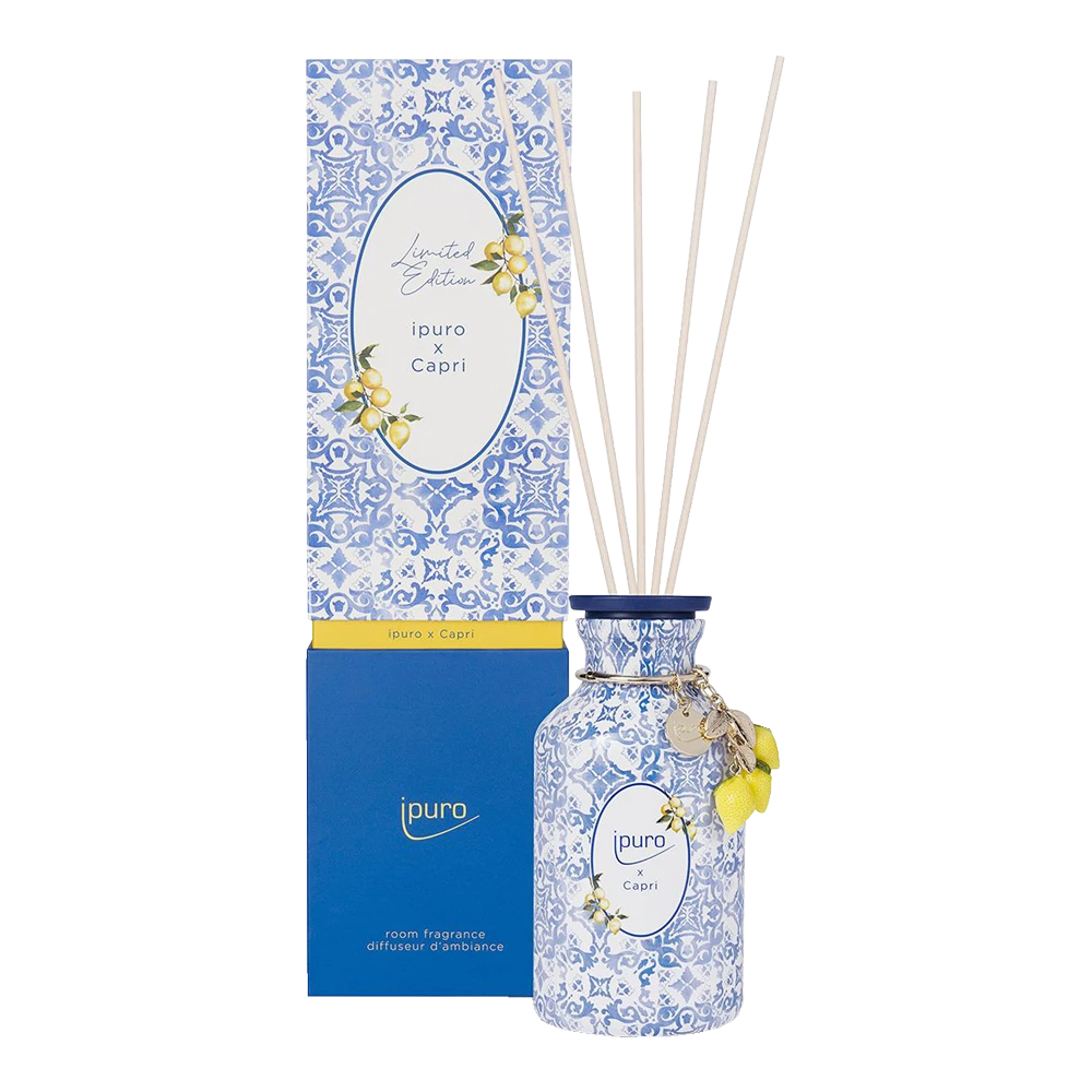De Limited edition Ipuro Geurdiffuser Capri 240ml is een diffuser die de heerlijke geur afgeeft van een zonnige dag op Capri. Met zwarte bes, zonnige citrustonen een delicate rozengeur, warme vanille en aromatisch cederhout. De fles is prachtig gedecoreerd en heeft een luxe uitstraling, waardoor deze prachtig staat in elk interieur. Limited Edition Geurstokjes!