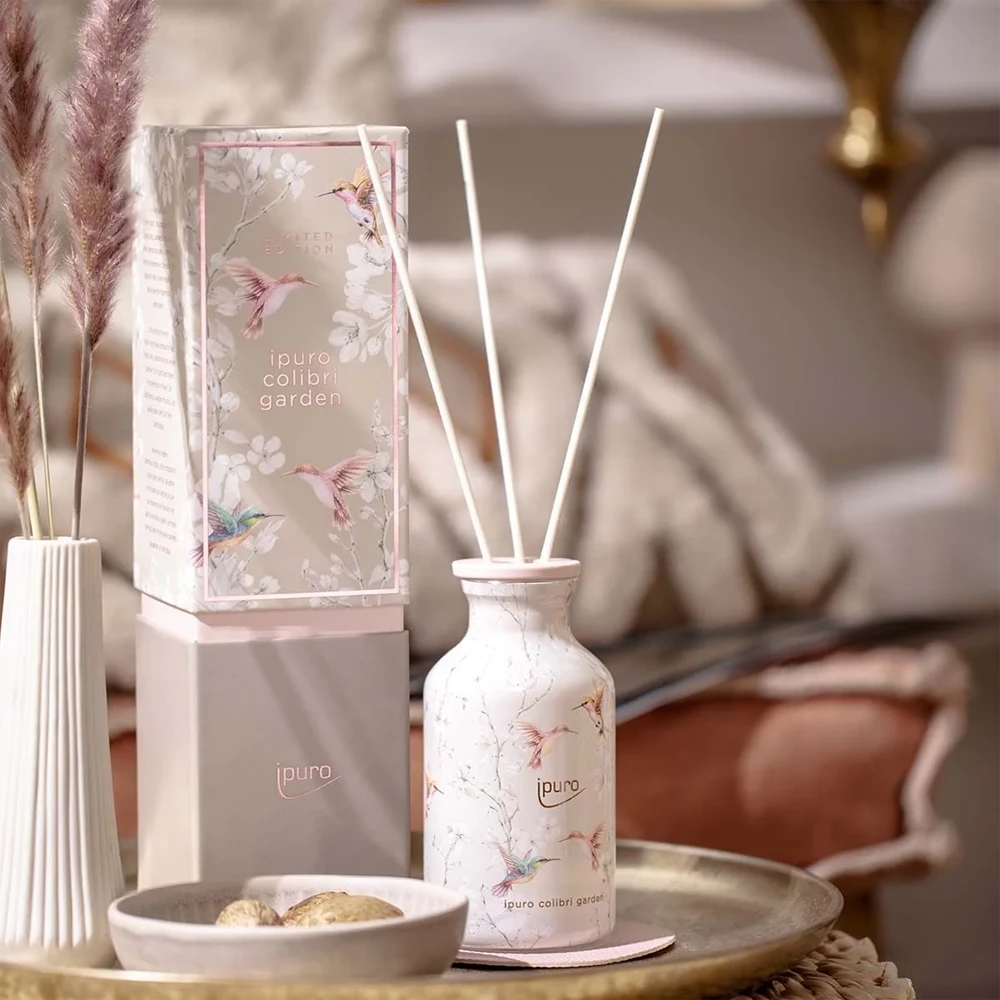 De Limited edition Ipuro Geurdiffuser Colibri Garden 240ml is een luchtige en lichte geur net als een kolibrie. Deze compositie van ylang-ylang, jasmijnbloesem en witte tuberoos zorgt voor een heel bijzondere ervaring van frisheid in de kamer. De geurtonen van witte musk en vanille geven de geur een zachte basis. Decoratie-upgrade: de bijpassende kleur onderzetter in de verpakking is het perfecte podium voor de fles. Het design van deze diffuser is prachtig en vrolijkt iedere ruimte op.